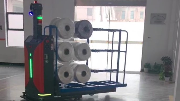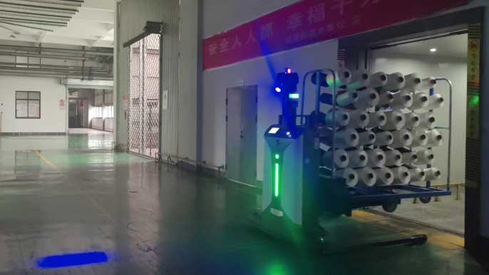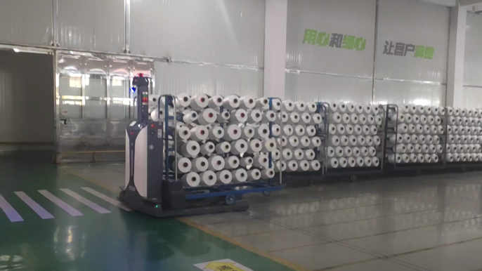 ATS自动丝车搬运系统由SLAM激光导航丝车搬运机器人、丝车输送机、丝车旋转机构等设备组成,系统解决挂丝后丝车转运难题。在丝饼数据管理系统和KGAS调度系统的调度管理下,实现物流全流程自动化和数字化管理,丝饼质量全流程可跟踪可追溯,满足化纤长丝高标准生产要求。