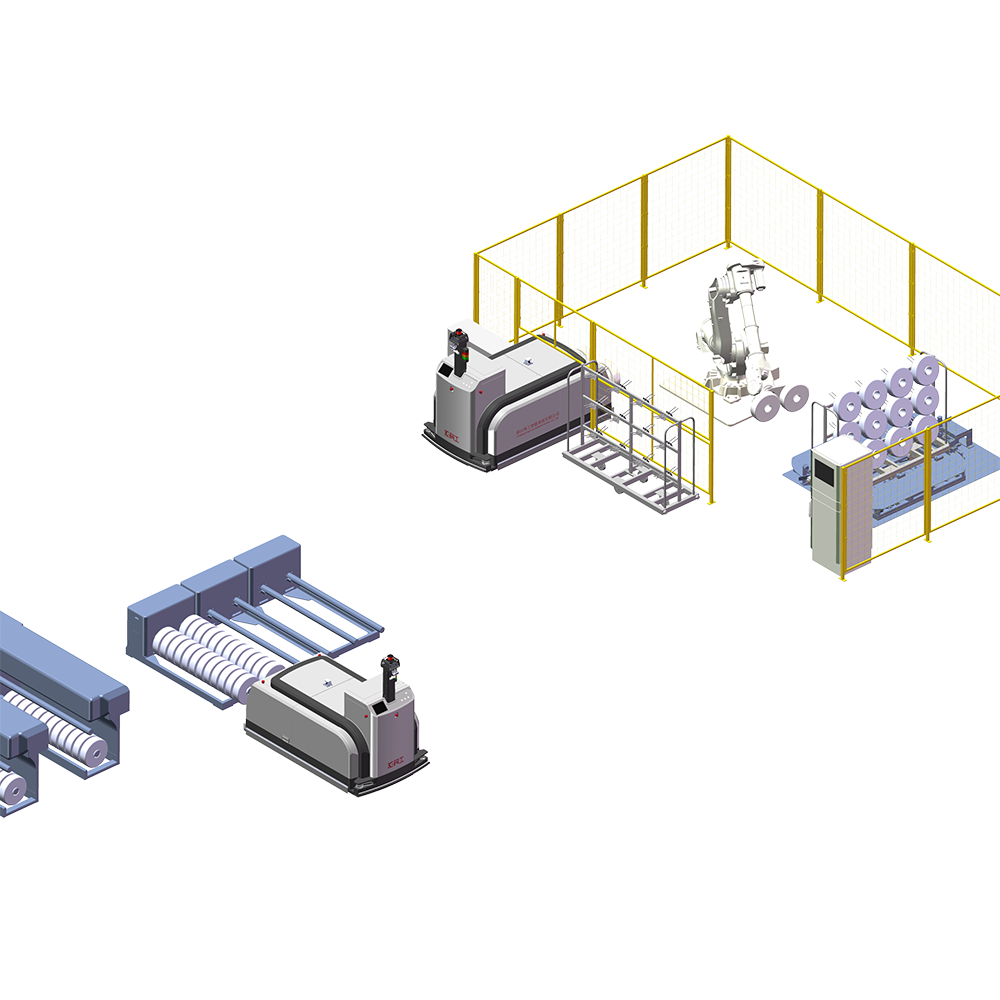 ATS自动丝车搬运系统由SLAM激光导航丝车搬运机器人、丝车输送机、丝车旋转机构等设备组成,系统解决挂丝后丝车转运难题。在丝饼数据管理系统和KGAS调度系统的调度管理下,实现物流全流程自动化和数字化管理,丝饼质量全流程可跟踪可追溯,满足化纤长丝高标准生产要求。