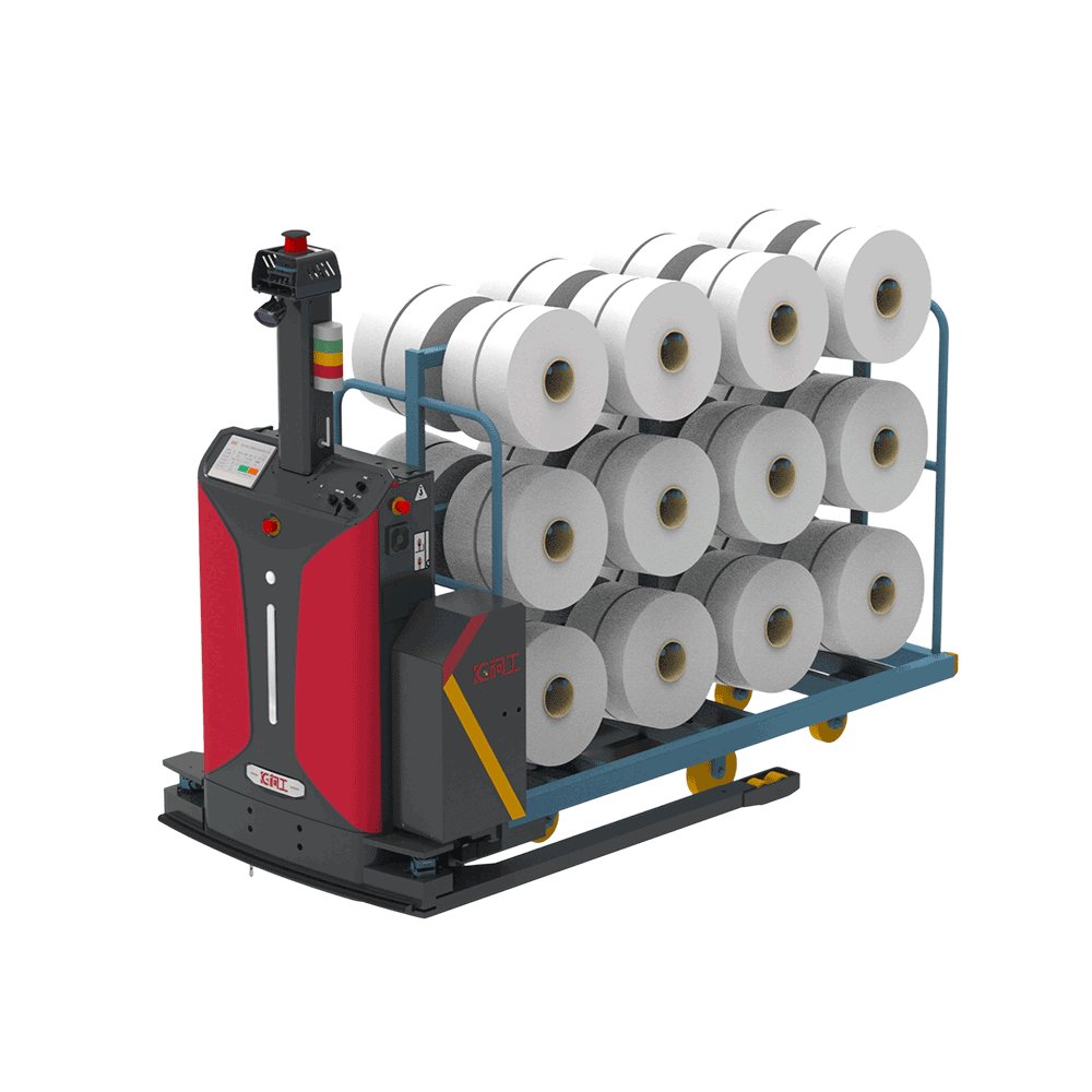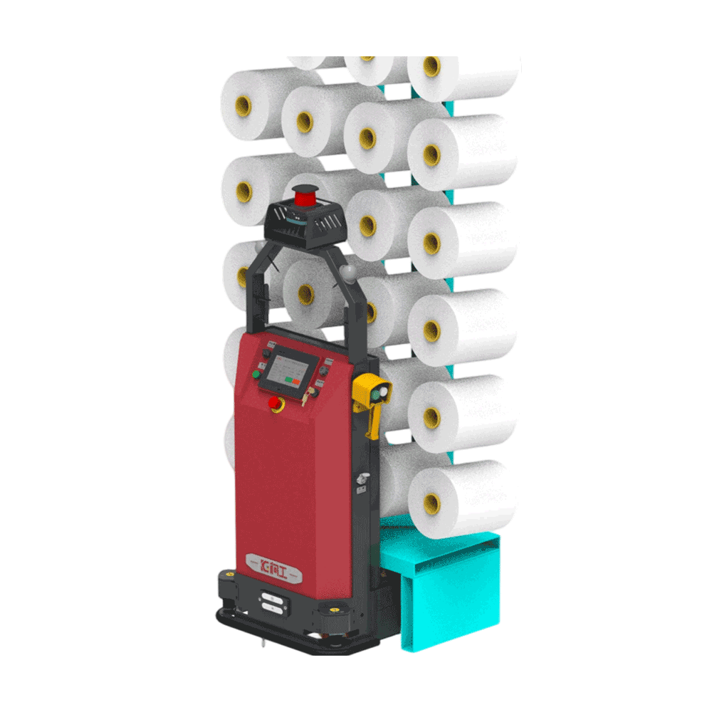 柯工智能丝架搬运AGV(TBC)采用超窄机身设计,转弯半径小,行驶速度快,专业适配化纤长丝工厂落丝后丝架快速搬运场景。